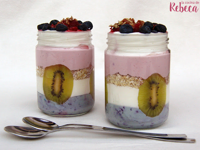 En esta versión, el helado deja paso al yogur, para controlar las calorías y para poder tomarlo en cualquier época del año e, incluso, llevárnoslo al trabajo, ya que los botes cierran perfectamente. ¿Por qué es de colores? Porque he batido el propio yogur con frutas. En este caso, una parte con frambuesas y otra con arándanos.
